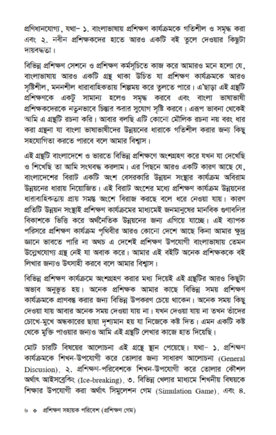এই গ্রন্থটি বাংলাদেশে ও ভারতে বিভিন্ন প্রশিক্ষণে অংশগ্রহণ করে যখন যা দেখেছি ও শিখেছি তা আমি সংঘবদ্ধ করলাম। এর পিছনে আরও একটি কারণ আছে যে, বাংলাদেশের বিরাট একটি অংশ বেসরকারি উন্নয়ন সংস্থার কার্যক্রম অবিরাম উন্নয়নের ধারায় নিয়োজিত। এই বিরাট অংশের মধ্যে প্রশিক্ষণ কার্যক্রম উন্নয়নের ধারাবাহিকতায় প্রায় সমস্ত অংশে বিরাজ করছে বলে ধরে নেওয়া যায়। কারণ প্রতিটি উন্নয়ন সংস্থাই প্রশিক্ষণ কার্যক্রমের মাধ্যমেই জন মানুষের মানবিক গুণাবলীর বিকাশকে ভিত্তি করে অর্থনৈতিক উন্নয়নের জন্য এগিয়ে যাচ্ছে। এই ব্যাপক পরিসরে প্রশিক্ষণ কার্যক্রম পৃথিবীর আরও কোন দেশে আছে কিনা আমার ক্ষুদ্র জ্ঞানে ভাবতে পারি না অথচ এ দেশেই প্রশিক্ষণ উপযোগী বাংলাভাষায় তেমন উল্লেখযোগ্য গ্রন্থ নেই যা অবাক করে। আমার এই বইটি অনেক প্রশিক্ষককে বই লিখার জন্যও উৎসাহী করবে বলে আমার বিশ্বাস।