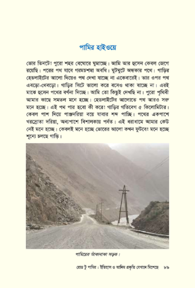 তাজিকিস্থানের প্রাচীন ইতিহাস, পামির মালভূমির আদিম প্রকৃতি, প্রাচীন বণিকদের রেশমপথ, মানুষ, সংস্কৃতি, খ্যাদাভাস, জীবন- সব মিলেমিশে বাংলাদেশি ভ্রমণকারী এলিজা বিনতে এলাহী রচনা করেছেন মধ্যএশিয়ার প্রাচীন রাজপথ ভ্রমণের এক আকরগ্রন্থ ‘রোড টু পামির’।